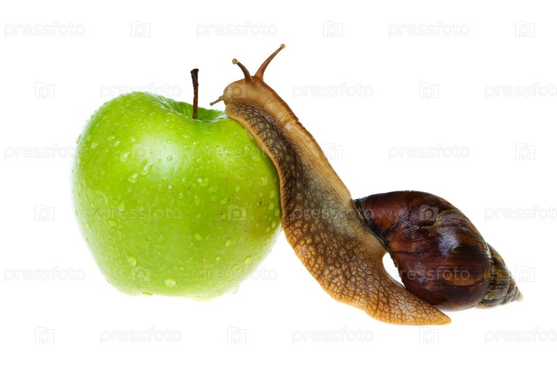 Улитка ползет по зеленому мокрому яблоку