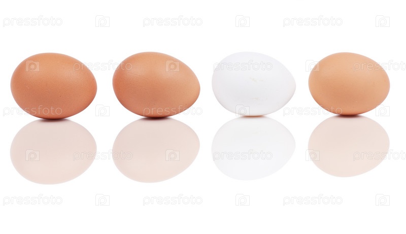 Одно белое и три коричневых куриных яйца на белом фоне