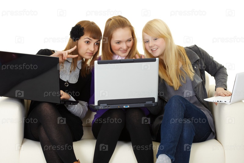 Три девушки на диване с ноутбуками
