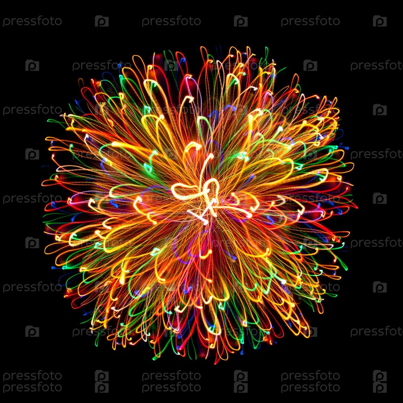 Светящийся шар из разноцветных нитей на черном фоне
