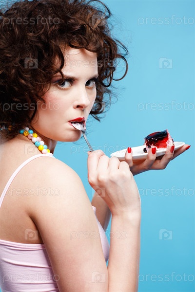 Красивая брюнетка ест кусок торта