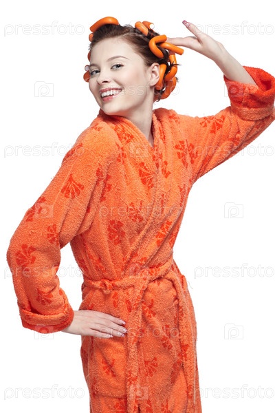 Девушка в оранжевом халате и бигудях на белом фоне