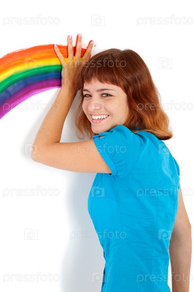 Рыжая девочка-подросток рисует радугу. Изолирована на белом фоне