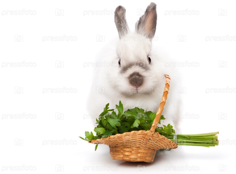 Кролик с корзиной зелени. Изолирован на белом фоне