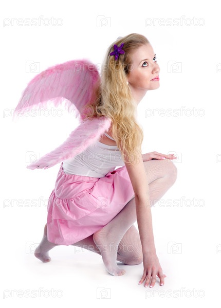 Молодая блондинка с крыльями. Изолирована на белом фоне