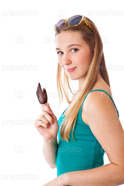 Улыбающаяся девушка с мороженым в руке. Изолирована на белом фоне