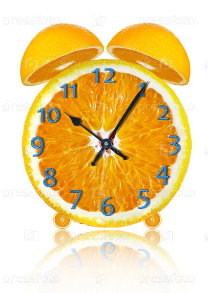 Апельсиновые часы на белом фоне