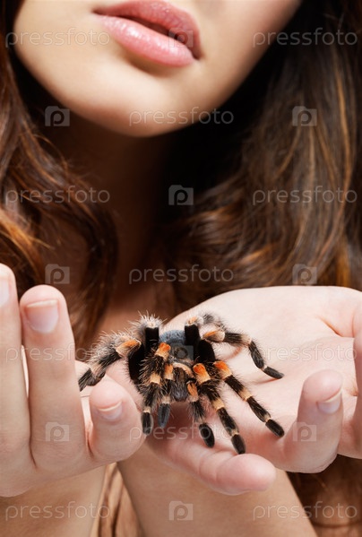 Фрагмент лица брюнетки с пауком в руках