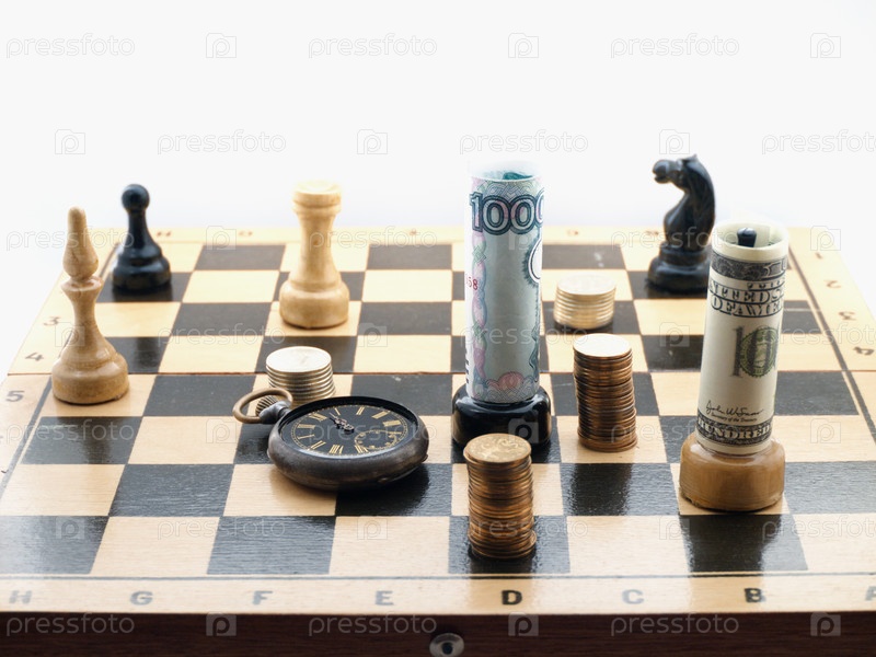 Шахматные фигуры с валютами России и США и часы на игровом поле
