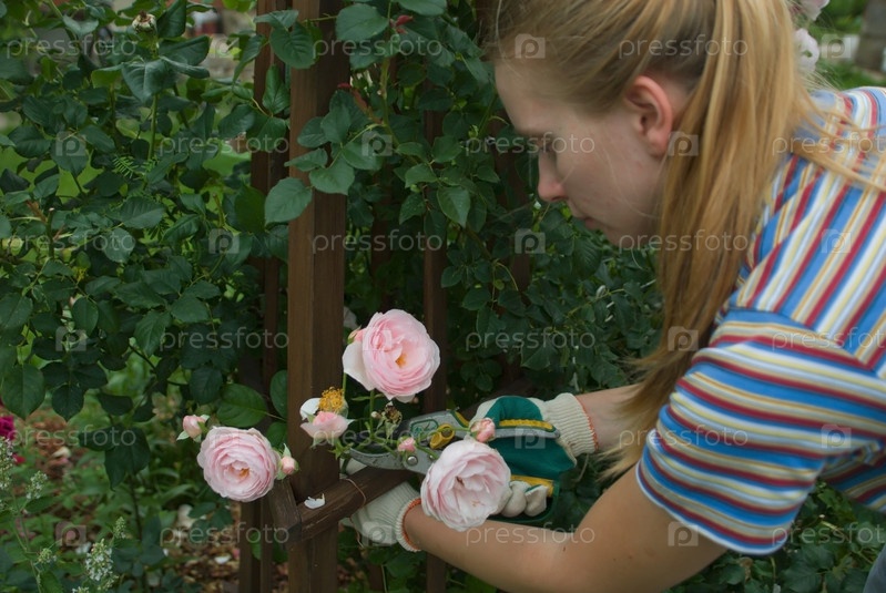Девочка ухаживает за розами в саду