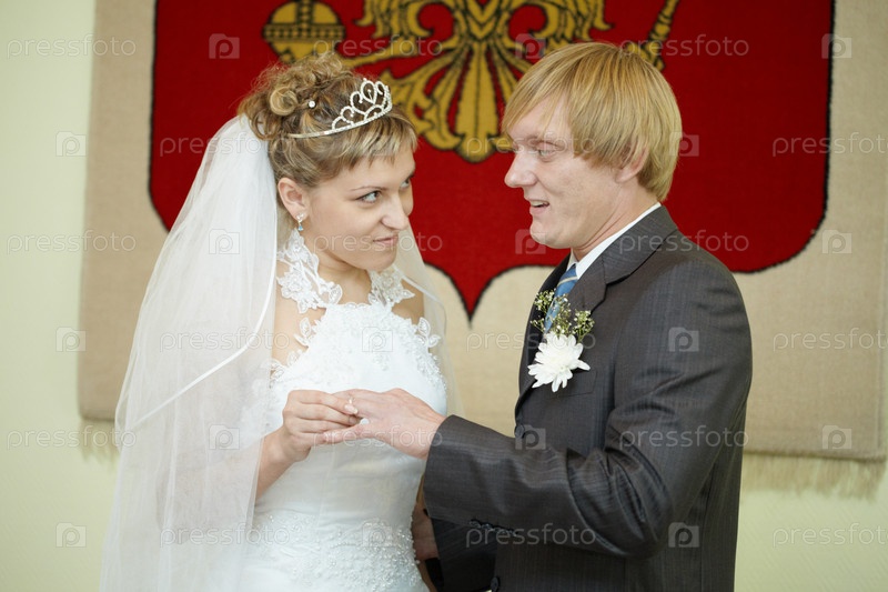 Невеста одевает обручальное кольцо жениху