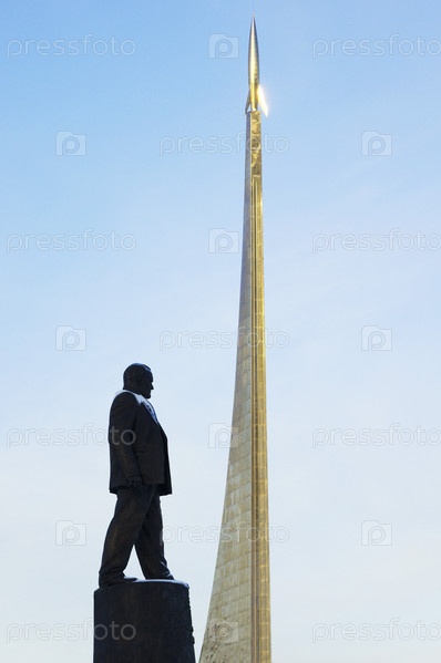 Памятник С. Королеву на фоне стеллы в честь покорителей космоса