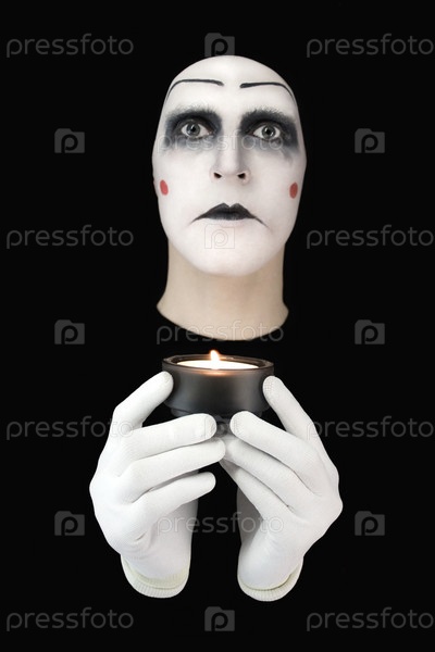 Портрет мима с горящими свечами на черном фоне