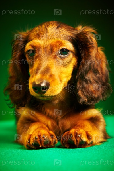 Щенок таксы на зеленом фоне