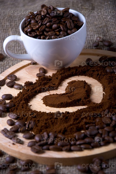 Сердце, нарисованное в молотом кофе, и кофе в зернах
