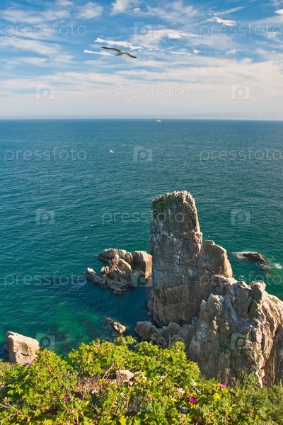 Скалистый берег и лазурное море под синим облачным небом
