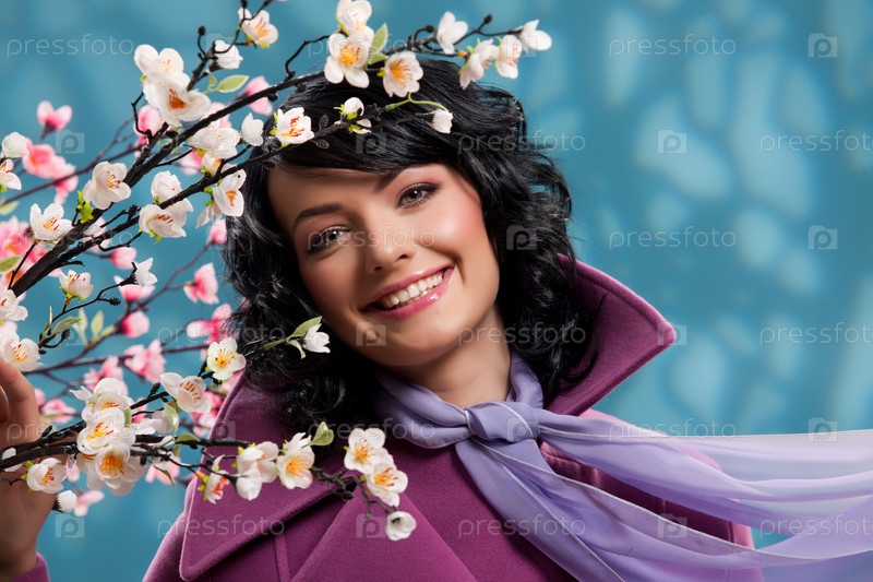 Молодая женщина на синем фоне с яблоней