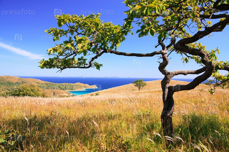 Причудливое дерево на фоне морского пейзажа