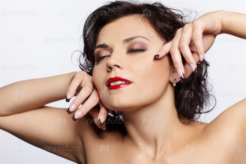 Портрет красивой брюнетки с закрытыми глазами, которая улыбается