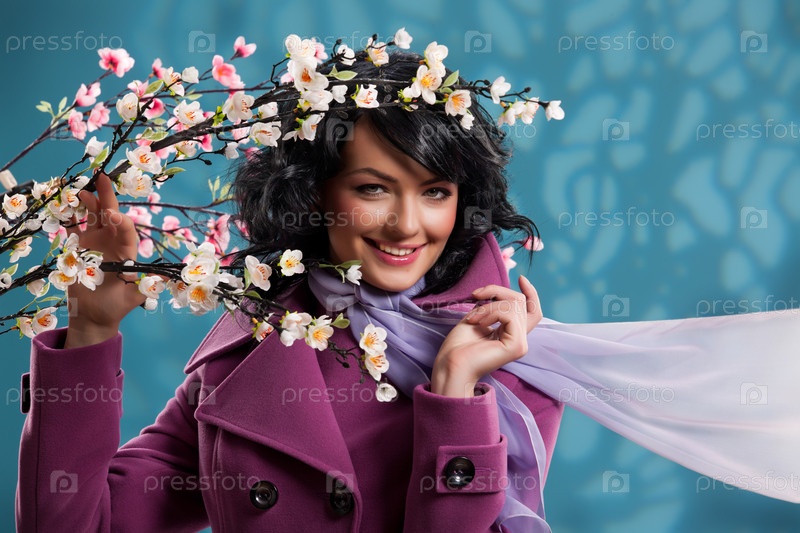 Молодая женщина на синем фоне с яблоней