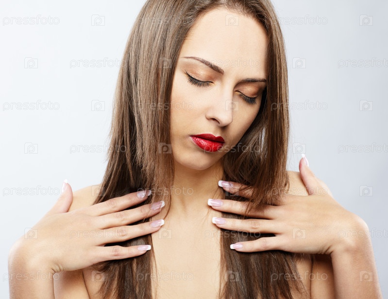 Портрет молодой девушки с длинными темными волосами и закрытыми глазами