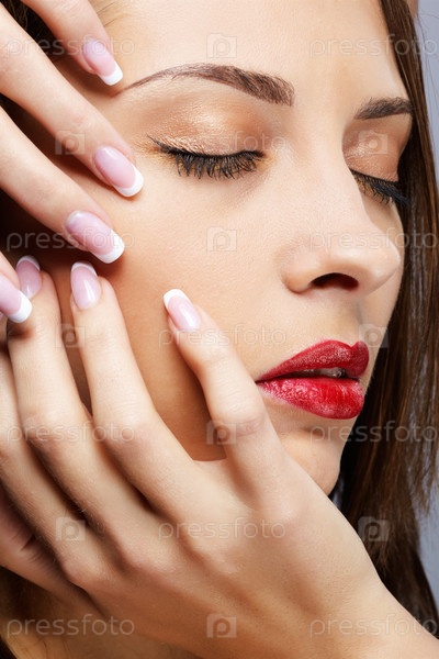 Портрет молодой девушки с длинными темными волосами и закрытыми глазами