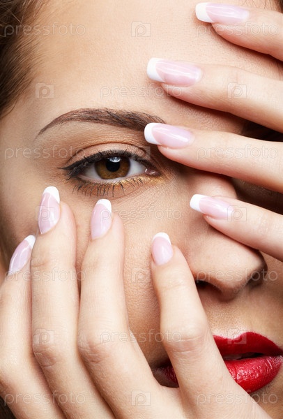 Крупным планом лицо девушки с красивым макияжем и маникюром