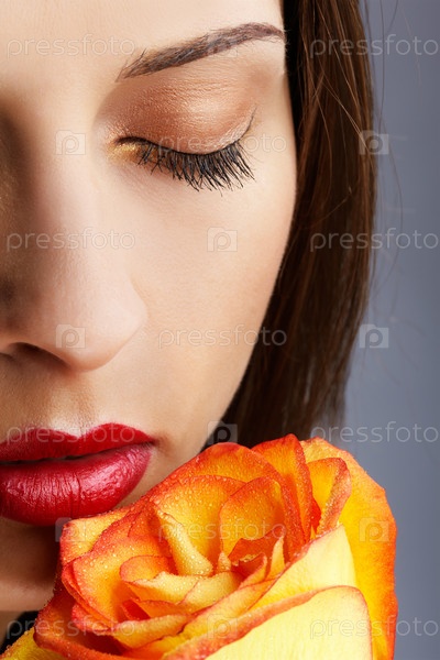 Портрет красивой брюнетки с закрытыми глазами, которая держит желтую розу