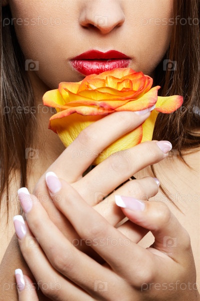 Девушка подносит к губам желтую розу