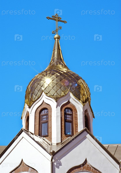 Купола православной церкви крупным планом на фоне голубого неба