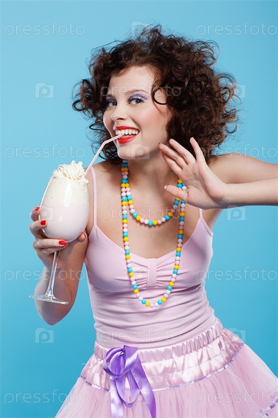 Счастливая девушка в розовой одежде пьет молочный коктейль