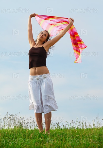 Девушка стоит на зеленом лугу с развевающимся платком