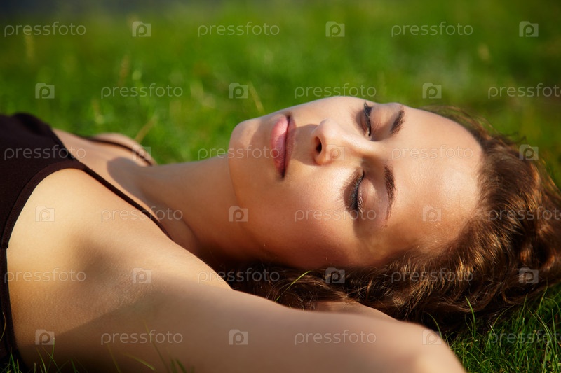Портрет спящей девушки, которая лежит на зеленой траве