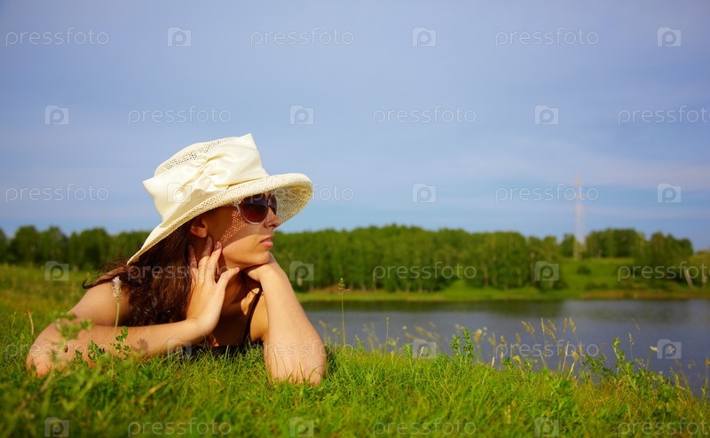 Девушка в шляпе лежит на зеленой траве