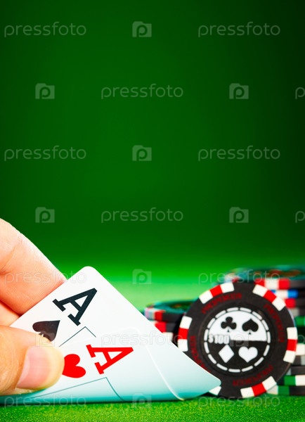 Стопка фишек и два туза на зеленом фоне