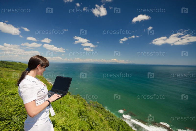 Девушка в деловой одежде с ноутбуком на фоне природы