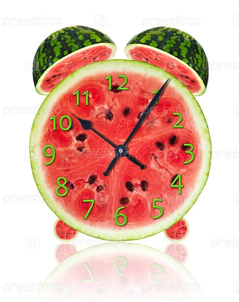 Будильник из арбуза на белом фоне