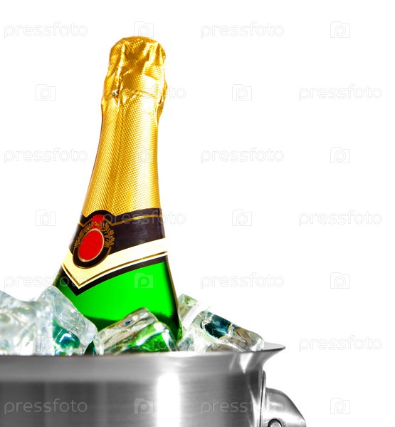 Бутылка шампанского в ведерке со льдом, на белом фоне