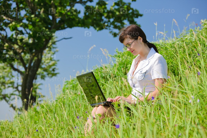 Девушка с ноутбуком на природе