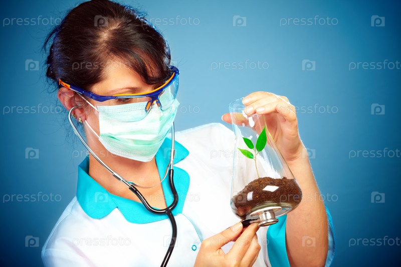 Женщина-ученый обследует зеленый саженец в стеклянной колбе