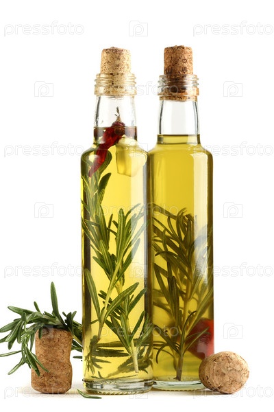 Оливковое масло с розмарином, чесноком и перцем на белом фоне