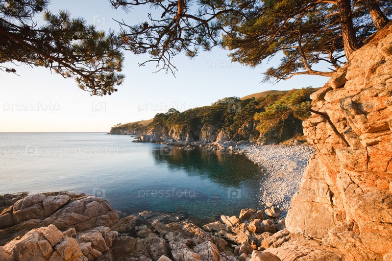 Прибрежные скалы с хвойными деревьями у Японского моря