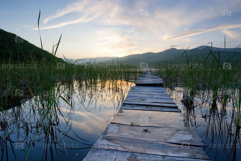 Покосившийся деревянный мост через заросшее камышом озеро