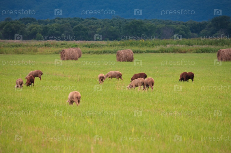Стадо овец пасется на поле среди стогов сена