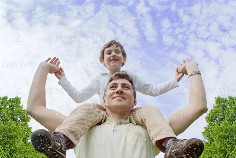 Счастливый отец и сын на фоне облачного неба
