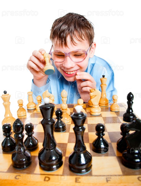 Юный шахматист на белом фоне