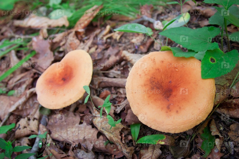 Грибы в лесу на фоне сухих листьев