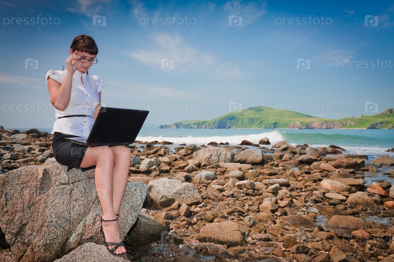 Молодая девушка в деловом костюме с ноутбуком на фоне каменистого берега