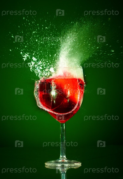 Разбивающийся бокал с красным вином на зеленом фоне