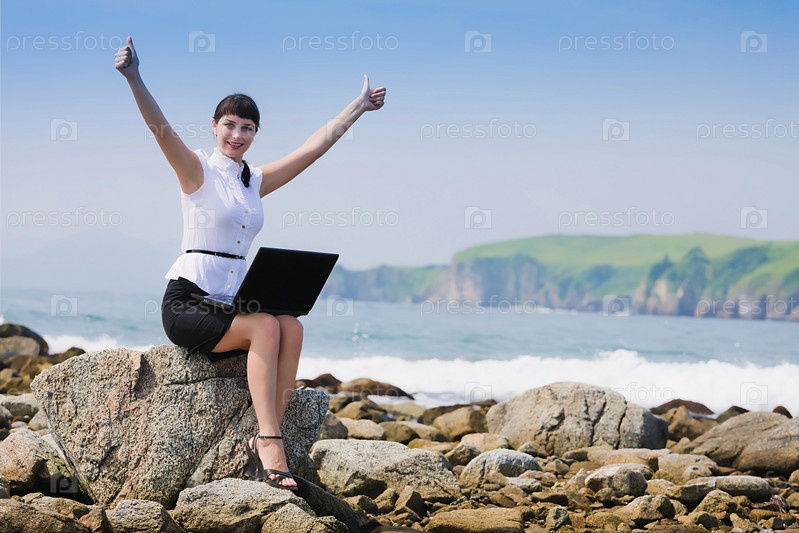 Молодая девушка с поднятыми вверх руками сидит на каменистом береге с ноутбуком